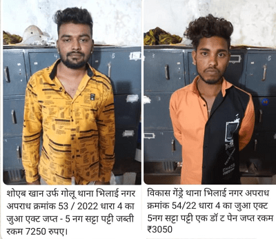 भिलाई / भिलाई नगर थाना के रूआबांधा क्षेत्र में पुनः सट्टा पट्टी लिखकर सट्टा का अवैध धंधा किया जा रहा है की सूचना पर थाना से पार्टी भेजकर रेड कराया गया , तो 2 लोग शोएब खान उर्फ गोलू तथा विकास गेंडे सट्टा पट्टी लिखते हुए पाए गए दोनों आरोपियों के पास से कुल रकम ₹10500.00 (दस हजार पाँच सौ) तथा सट्टा पट्टी जब्ती कर धारा 4 क जुआ एक्ट के तहत दोनों को गिरफ्तार किया गया। पृथक से प्रतिबंधात्मक कार्यवाही भी किया गया।