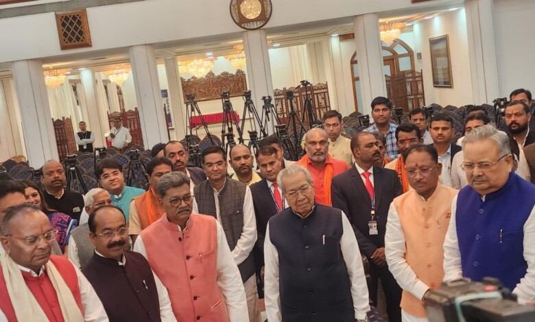 शनिवार रात 8.30 बजे राज्यपाल हरिचंदन दिल्ली से लौटे। मुख्यमंत्री विष्णुदेव साय,डिप्टी सीएम अरुण साव, डिप्टी सीएम विजय शर्मा, पूर्व मुख्यमंत्री डॉ. रमन सिंह और पूर्व मुख्यमंत्री भूपेश बघेल,नेता प्रतिपक्ष चरणदास महंत दुर्ग ग्रामीण विधायक ललित चंद्राकर जी शपथ ग्रहण में उपास्ती रहे राजभवन से सीएम विष्णुदेव साय और दोनों डिप्टी सीएम विधानसभा गए । ललित चंद्राकर जी ने डॉ.रमन सिंह स्पीकर बनाने पर शुभकामनाएं दी ।