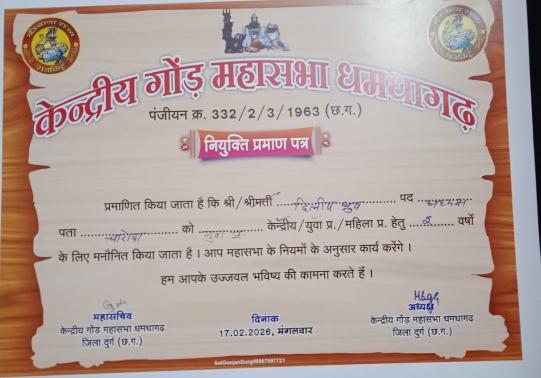 भिलाई। केन्द्रीय गोंड महासभा धमधागढ के केन्द्रीय अध्यक्ष एम डी ठाकुर जी ने केन्द्रीय गोंड महासभा धमधागढ युवा प्रभाग अध्यक्ष भिलाई 3 चरौदा के पुर्व एल्डरमैन एवं गोंड समाज के संघर्षशील, सक्रिय युवा, ऊर्जावान सदस्य दिलीप ध्रुव को नियुक्त किया है।