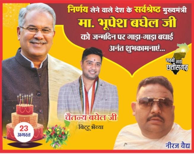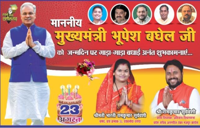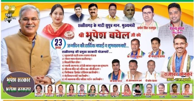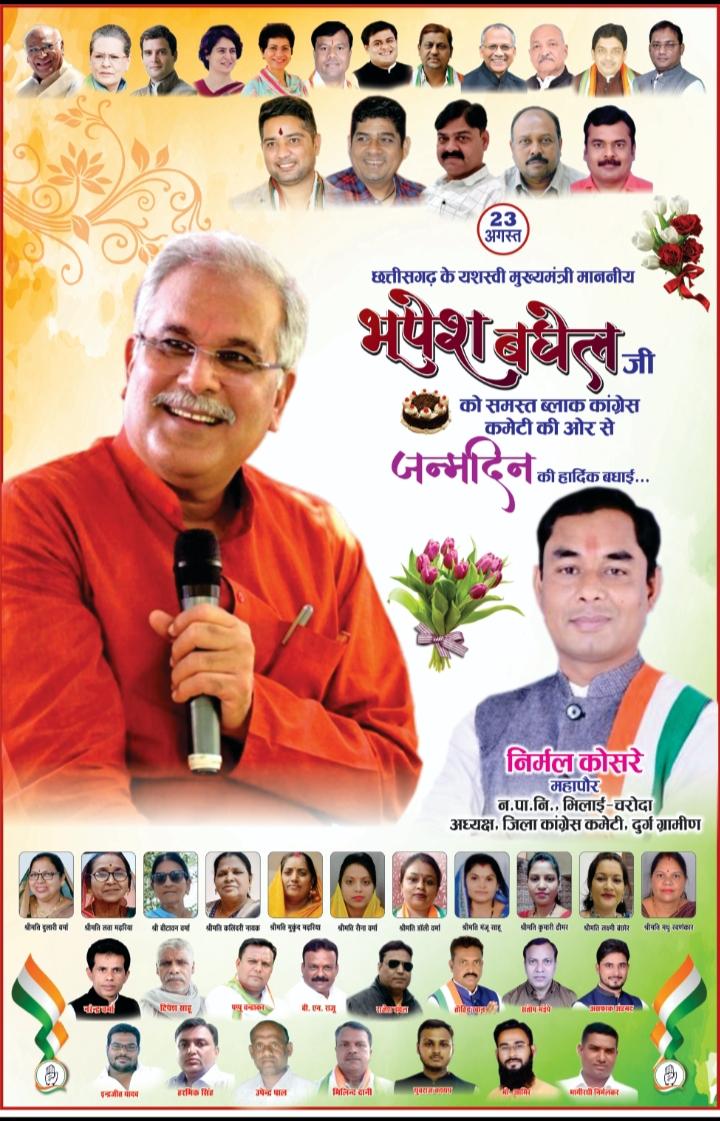 बता दे कि छत्तीसगढ़ के मुख्यमंत्री श्री भूपेश बघेल जी के जन्मदिन का यह 63 वा वर्ष है। मुख्यमंत्री भूपेश बघेल जी के चहेते, प्रशंसक, कार्यकर्ता, नेता, किसान, मजदूर, छात्र बुद्धिजीवी सभी मिलकर मुख्यमंत्री के जन्मदिन को क्षेत्र का ही नही बल्कि छत्तीसगढ़ के किसान परिवार का गौरव के रूप में बनाने जा रहे है। जन्मदिन के उपलक्ष में सांस्कृतिक कार्यक्रम के साथ-साथ 63 कार्यकर्ता द्वारा रक्तदान किया जाएगा। साथ ही स्वास्थ्य अमला की व्यवस्था पूरी तरह व्यवस्थित रहेगी। जन्मदिन के कार्यक्रम में शामिल सभी आगंतुकों के लिए दोपहर में भोजन की व्यवस्था उपलब्ध रहेगी। मुख्यमंत्री श्री बघेल जी के जन्मदिन के सम्मान में 25000 की संख्या में कार्यकर्ताओं द्वारा पाटन से बाइक रैली निकालते हुए कुम्हारी पहुंचेंगे। सुबह 11:00 बजे से कार्यक्रम प्रारंभ होगा जो कि अनुमानत शाम 5:00 बजे तक बधाई एवं शुभकामनाएं जारी रहेगा।