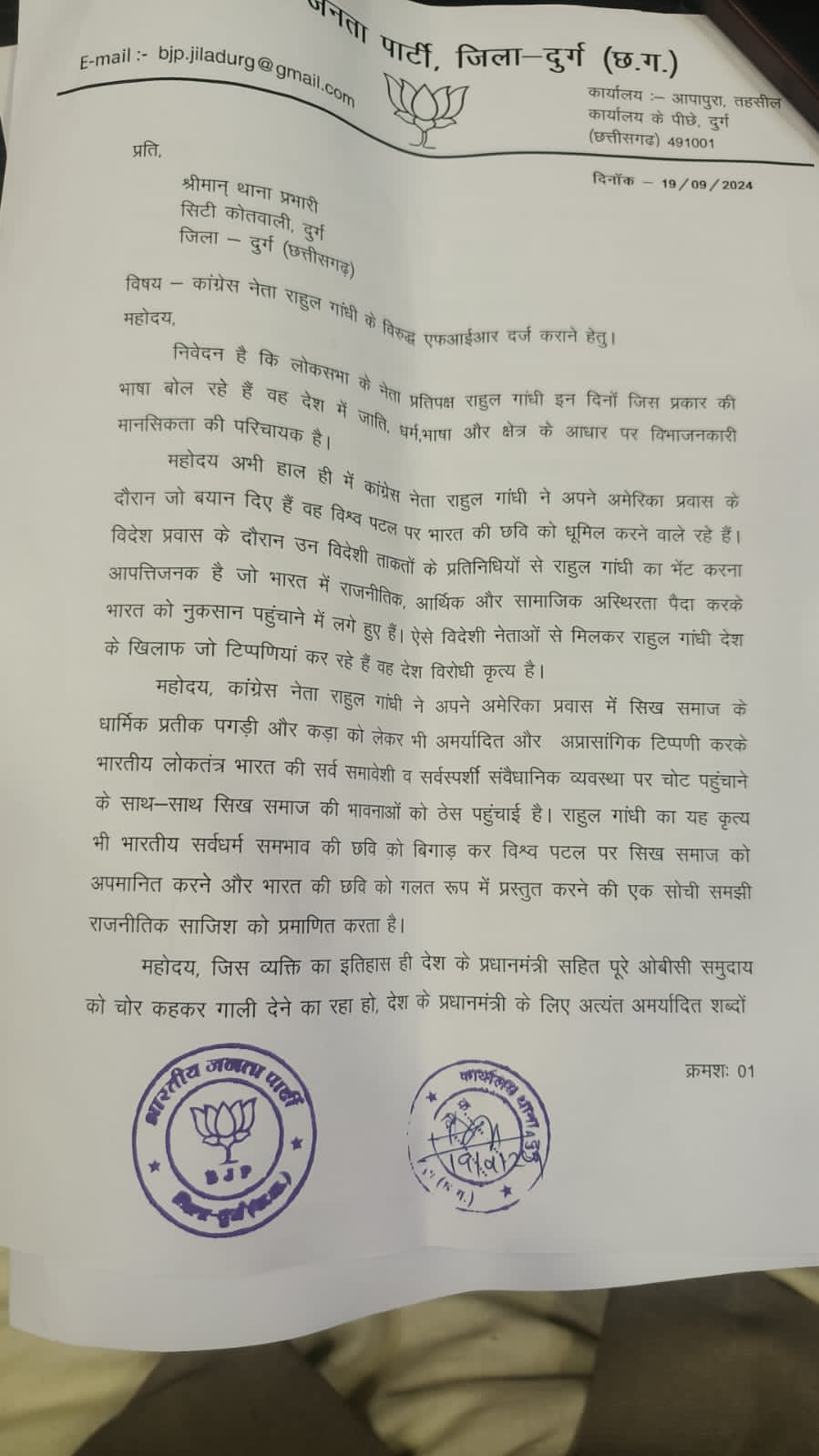 राहुल गांधी के कृत्यों पर आपत्ति व्यक्त करते हुए जिला भाजपा अध्यक्ष जितेन्द्र वर्मा ने कहा कि राहुल गांधी पाकिस्तान परस्त भारत विरोधी लोगों के साथ गलबहियाँ कर रहे हैं, वे आतंकियों के समर्थन वाले कार्यक्रम में जाकर खड़े हो जाते हैं, देश को तोड़ने वाली ताकतों से समर्थन मांगते हैं और विदेशी ताकतों से देश के लोकतंत्र में हस्तक्षेप करने की मांग करते हैं। राहुल गांधी देश में आरक्षण और जाति की राजनीति कर एक समाज को दूसरे समाज से खिलाफ भड़काते हैं। राहुल गांधी विदेशी धरती पर जाकर आरक्षण को खत्म कर दलितों, पिछड़ों और आदिवासियों का हक छिनने की मंशा जाहिर करते हैं, राहुल गांधी की ऐसे सारे कृत्य गंभीरतम अपराध की श्रेणी में आते हैं अतः भाजपा के आवेदन को स्वीकार कर तत्काल प्रभाव से प्रथम सूचना प्रतिवेदन दर्ज कर आवश्यक कानूनी कार्रवाई की जाए।इस दौरान मौजूद दुर्ग शहर विधायक गजेंद्र यादव ने कहा कि विदेशी धरती पर जाकर राहुल गांधी भारतीय सर्व धर्म समभाव की छवि को बिगाड़ कर विश्व पटल पर सिख समाज को अपमानित करने और भारत की छवि को गलत रूप में प्रस्तुत करने की सोची समझी राजनीतिक साजिश कर रहे हैं। अमेरिका में जम्मू कश्मीर की शांति के खिलाफ विषवमन, आतंकियों की रिहाई,a पाकिस्तान से बातचीत, पाकिस्तान के साथ व्यापार और धारा 370 को फिर से लागू करने का समर्थन करते हैं। सिख भाइयों की पगड़ी और कड़े पर विवादास्पद बयान देते हैं। ऐसा करके राहुल गांधी देश की राजनीतिक, आर्थिक और सामाजिक अस्थिरता पैदा करके भारत को नुकसान पहुंचाने में लगे हुए हैं ऐसे विदेशी नेताओं से मिलकर राहुल गांधी देश के खिलाफ जो टिप्पणियां कर रहे हैं वह देश विरोधी कृत्य है।