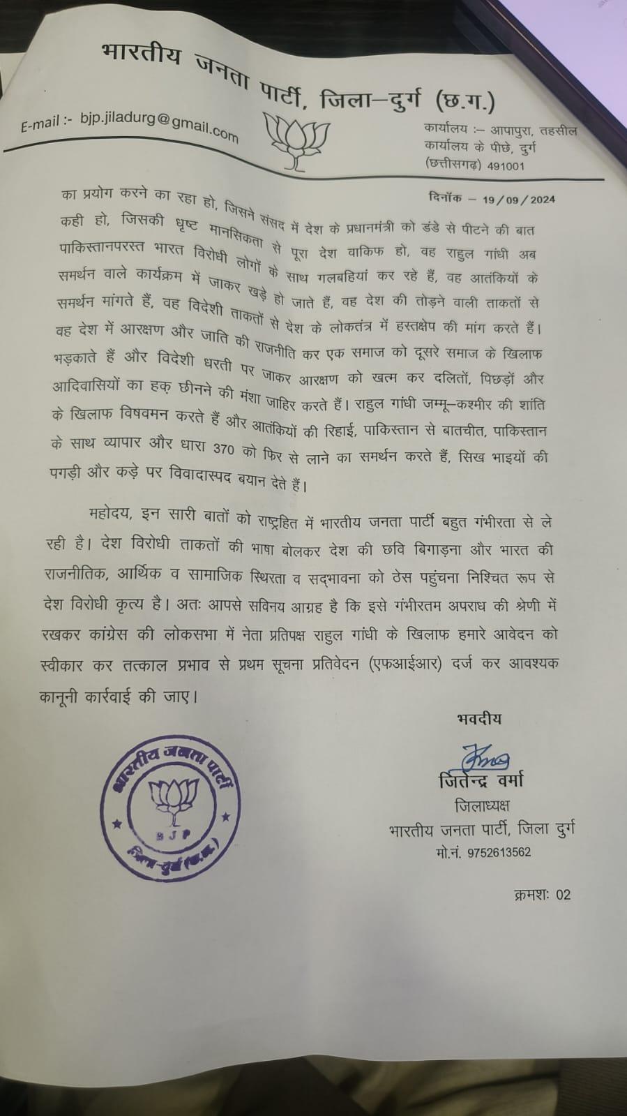 राहुल गांधी के खिलाफ दुर्ग जिला भाजपा ने दर्ज कराई एफआईआर :: भारतीय न्याय संहिता की विभिन्न धाराओं के अंतर्गत दर्ज हुआ मामला दुर्ग जिला भाजपा ने दर्ज कराई एफआईआर