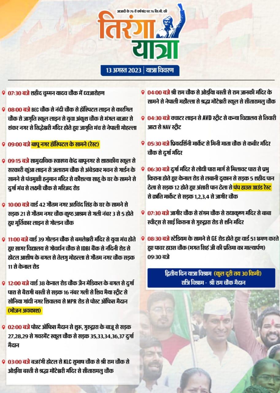खुर्सीपार क्षेत्र के बीईसी चौक से नंदी चौक से हॉस्पिटल लाइन से कारगिल चौक से जागृति स्कूल लाइंस युवा अंकुश चौहान मंगल बाजार शंकर नगर सिद्धेश्वरी मंदिर होते हुए जागृति मंच से नेपाल मोहल्ला पहुंचे। फिर इसके बाद बापूनगर हॉस्पिटल के सामने रेस्ट किया। 15 मिनट के रेस्ट के बाद फिर से तिरंगा यात्रा अपने लक्ष्य की ओर आगे निकल पड़ी और सामुदायिक स्वास्थ्य केंद्र बापू नगर से शासकीय स्कूल, सरकारी स्कूल जलाराम चौक अंबेडकर भवन, गार्डन के सामने पंचमुखी हनुमान मंदिर , कौशल्या साहू के घर के से होते हुए दुर्गा मंच लक्ष्मी चौक से मस्जिद रोड पहुंचे। इसके बाद सुबह करीब 10 बजे वार्ड 42 गौतम नगर, अरविंद सिंह के घर के सामने से होते हुए कुष्ठ आश्रम पहुंचे। जहां लोगों से मिले और मूर्तिकार लाइन से गोल्डन चौक पहुंचे। 11 बजे वार्ड 39 गोल्डन चौक से मां बमलेश्वरी मंदिर से युवा मंच होते हुए सागर विद्यालय, गोवर्धन चौक, नंदिनी रोड, होटल आशीष के बगल से तेलुगू मोहल्ला गौतम नगर चौक कैनल रोड में प्रवेश किया। 12 बजे वार्ड 38 कैनल रोड चौक जैन मेडिकल के बगल से दुर्ग पर बैरागी बस्ती से सड़क, 16 गली स्ट्रीट लाइट, सोनिया गांधी, शिवालय में एमपीआर रोड में पोस्ट ऑफिस मतदान में विश्राम किये। यही पर शिवालय में तिरंगा यात्रा में शामिल सभी सम्मानित जनों ने दोपहर का भोजन किया और करीब 1 घंटे के विश्राम के बाद पोस्ट ऑफिस मैदान से फिर से यात्रा शुरू हुई। जो गुरुद्वारा के बाजू से सड़क 27, 28, 29 से गवर्नमेंट स्कूल से दुर्गा मैदान फिर बजरंगी होटल से सुभाष चौक श्री राम चौक उड़िया बस्ती, नेपाली मुहल्ला श्रद्धा मुंडेश्वरी स्कूल कन्या विद्यालय तिवारी आटा एनएवी स्ट्रीट प्रदर्शनी मार्केट से होते हुए रात करीब 7:30 बजे स्टेडियम के सामने जी रोड होते हुए वार्ड 51 भ्रमण करते हुए पावर हाउस चौक भगत सिंह जी की प्रतिमा पर माल्यार्पण की है। आज दूसरे दिन यात्रा हमें करीब 30 किलोमीटर पदयात्रा की गई और श्री राम चौक मंदिर में विधायक देवेंद्र यादव विश्राम करेंगे ।।