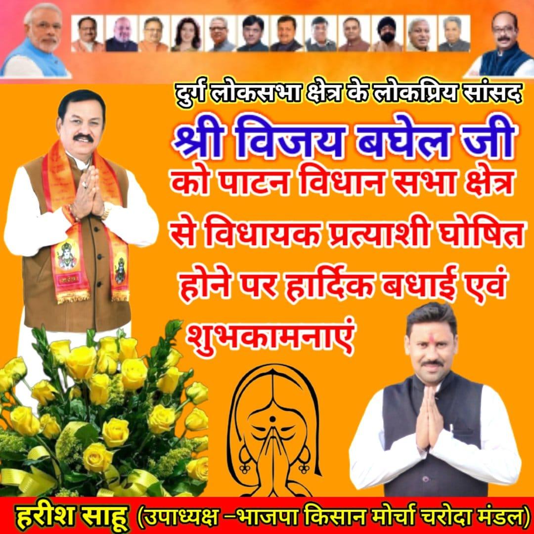 इस अवसर पर जिला भाजपा अध्यक्ष जितेंद्र वर्मा ने कहा कि प्रधानमंत्री नरेंद्र मोदी, राष्ट्रीय अध्यक्ष जेपी नड्डा एवं केंद्रीय चुनाव समिति के सदस्यों का हृदय से धन्यवाद ज्ञापित करता हूं जिन्होंने प्रदेश के आतताई मुख्यमंत्री भूपेश बघेल से मुक्ति के लिए प्रदेश में सर्वाधिक मतों से लोकसभा चुनाव जीतने वाले और पूर्व में भी मुख्यमंत्री भूपेश बघेल को पटकनी देने वाले सांसद विजय बघेल को पाटन विधानसभा क्षेत्र से प्रत्याशी घोषित किया। अब मुख्यमंत्री भूपेश बघेल तैयार रहें, उनकी और उनकी पार्टी की प्रदेश में और पाटन विधानसभा में हार सुनिश्चित है। मैं भारतीय जनता पार्टी दुर्ग जिला के समस्त पदाधिकारी में कार्यकर्ताओं की ओर से सांसद विजय बघेल जी को जीत की अग्रिम बधाई एवं शुभकामनाएं देता हूं।